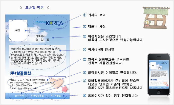 - 모바일 명함을 제작해드립니다. 인사말, 연락처, 약도등 기본 내용이 소개됩니다.